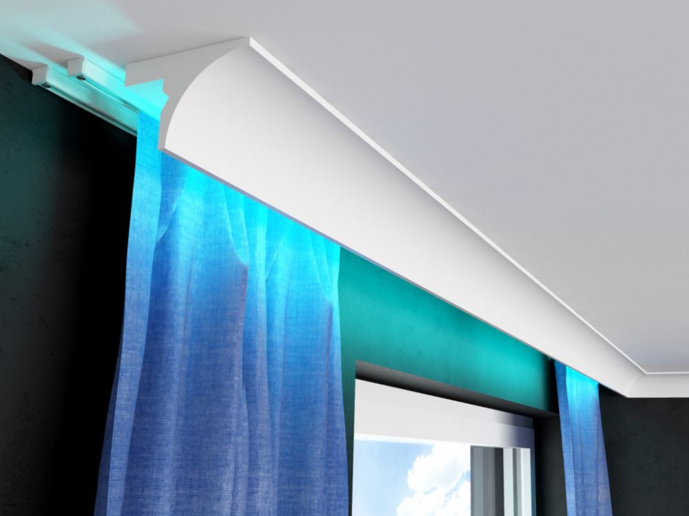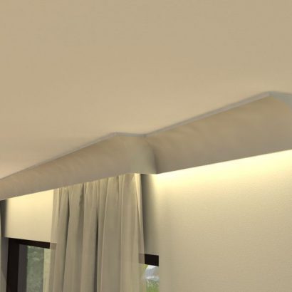 Gardinenblende Stuck „Madrid“ aus beständigem EPS200-Styropor gefertigt und mit einer edlen Quarzsand-Beschichtung veredelt. Somit erhalten Sie das Stuckmaterial bereits vorbereitet für die Montage und den Anstrich.